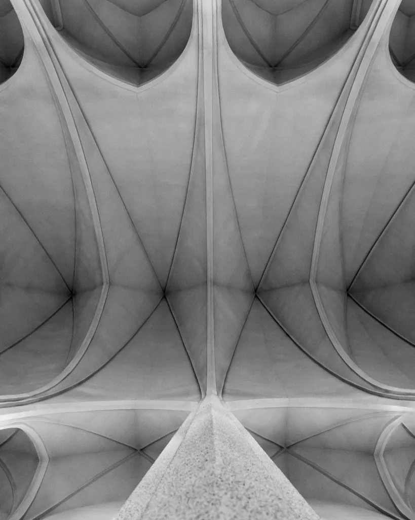 Всередині — несподівана аскеза. Натуральне світло вливається крізь високі прозорі вікна між шестигранними колонами. Ніякого кольору, ніякого барокового буяння. Тільки світло, камінь і пропорція. Бог — у геометрії.